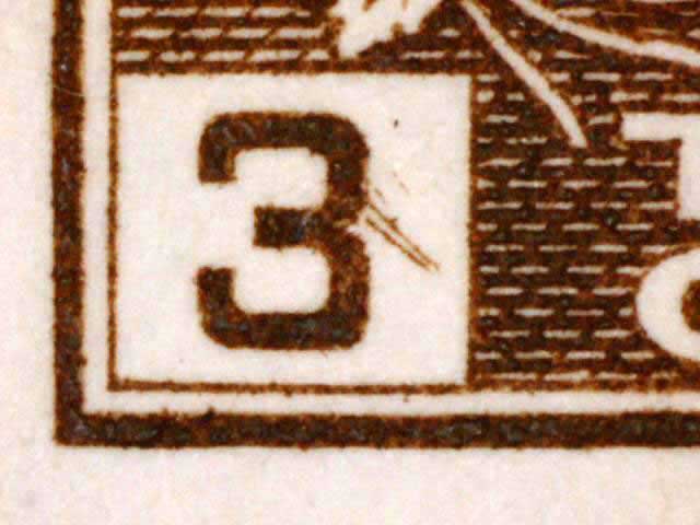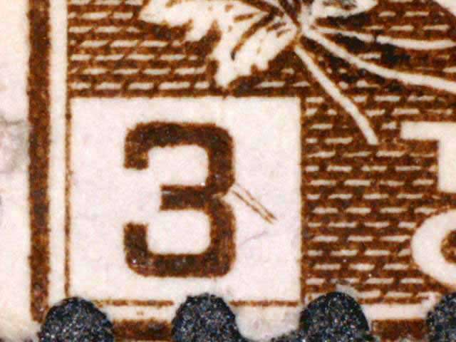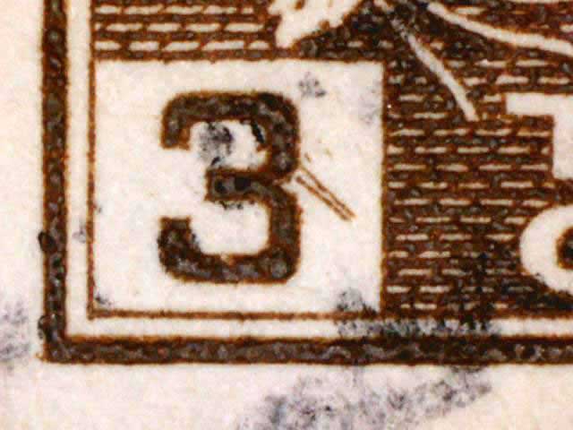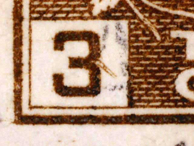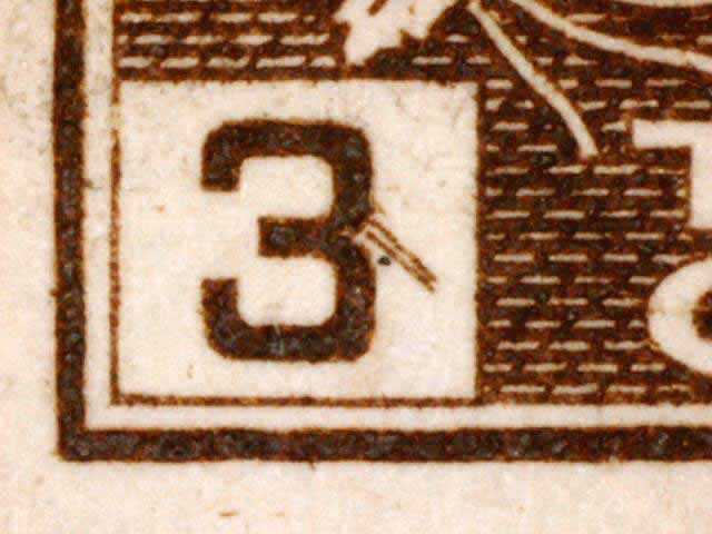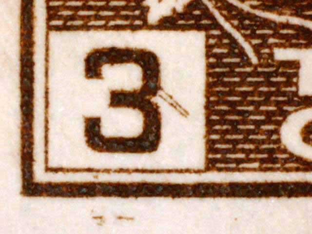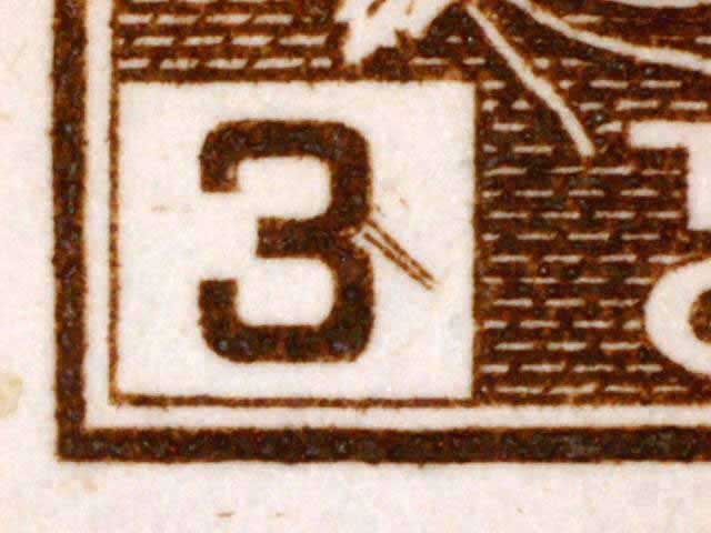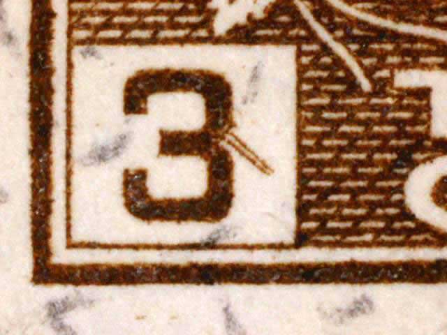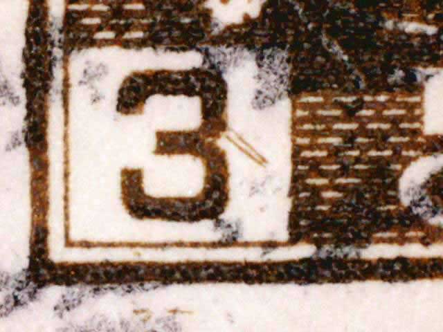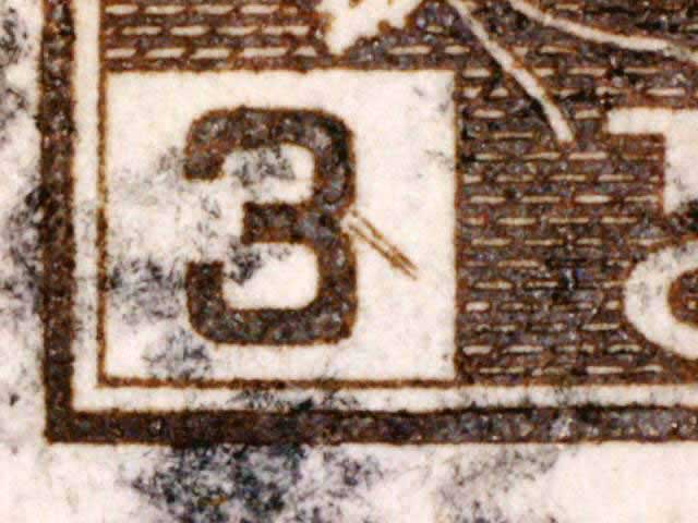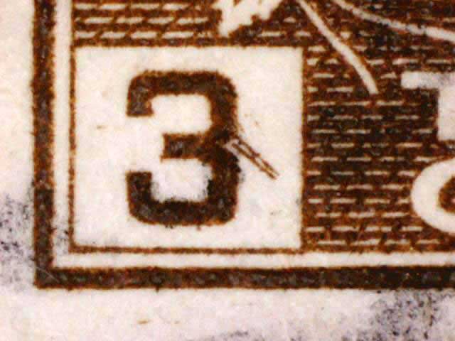 The main evidence of this consists of two relatively parallel lines at an approximate 45* angle coming off of the lower left corner 3. The position of these lines varies slightly from plate position to plate position. The very first stamp is the only example found so far with the placement of the lines near the bottom of the 3 rather than the middle. Please notify me of any other examples of this type.