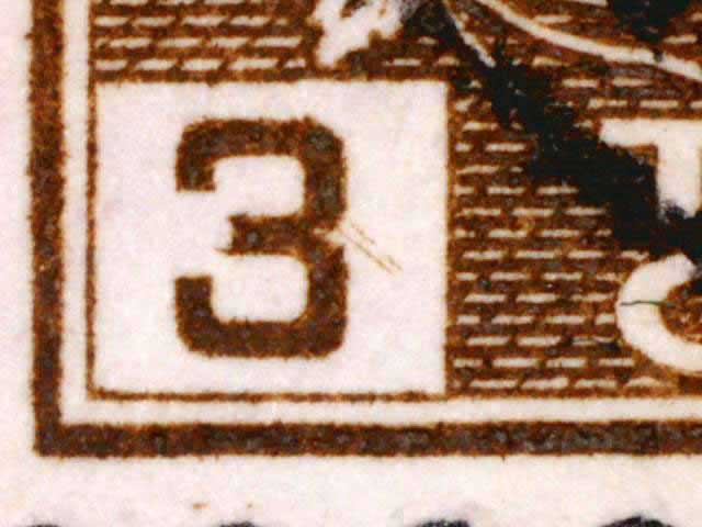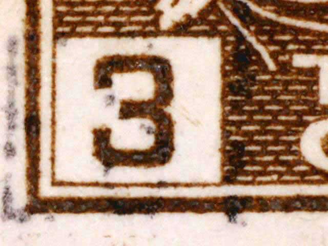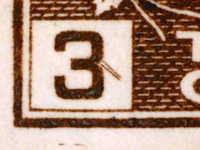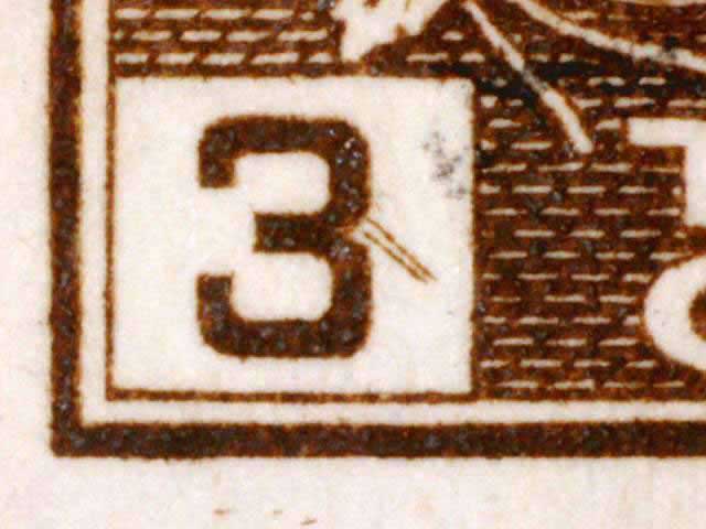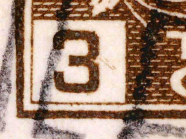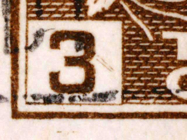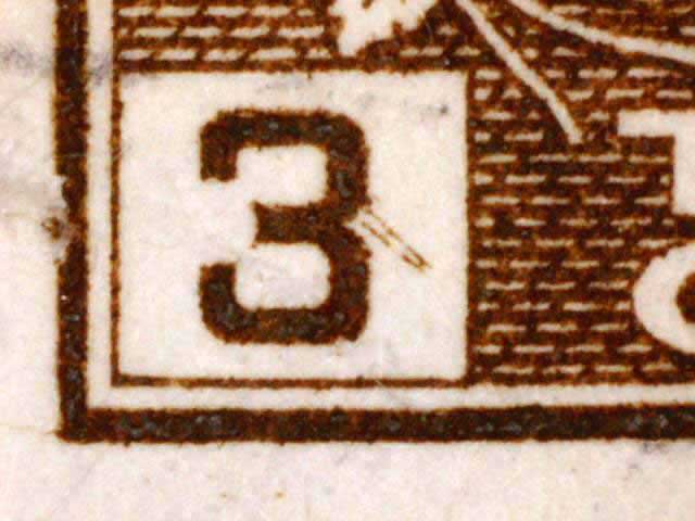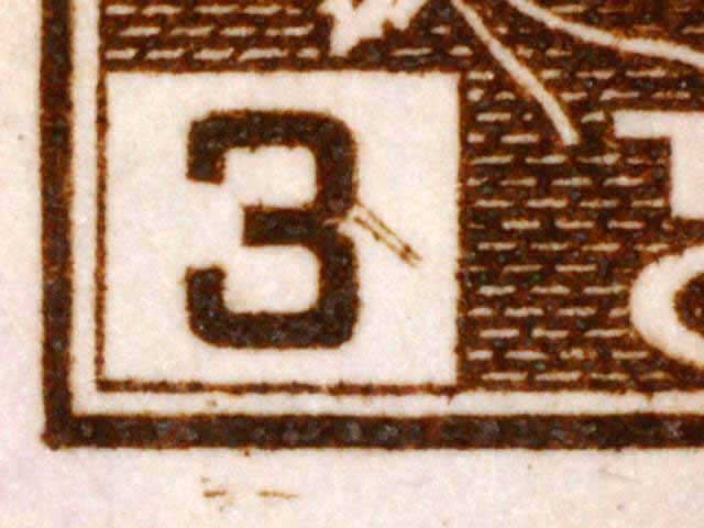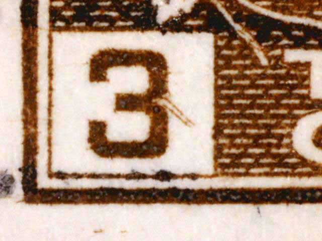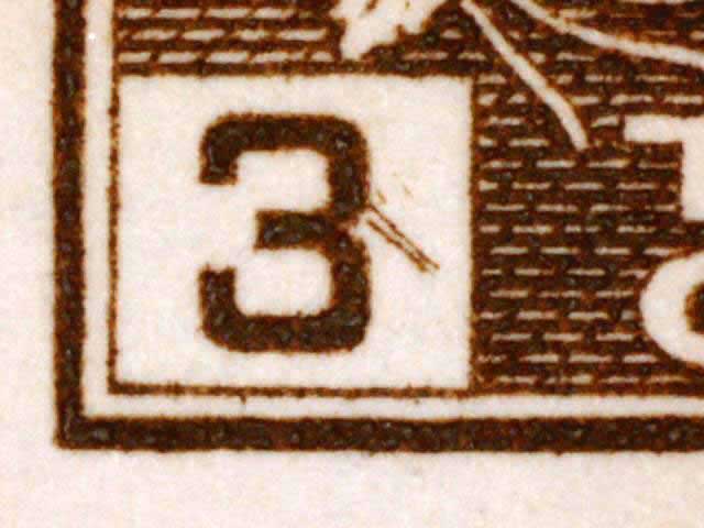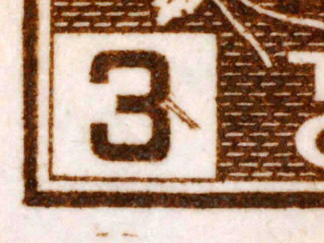 The main evidence of this consists of two relatively parallel lines at an approximate 45* angle coming off of the lower left corner 3. The position of these lines varies slightly from plate position to plate position. The very first stamp is the only example found so far with the placement of the lines near the bottom of the 3 rather than the middle. Please notify me of any other examples of this type.