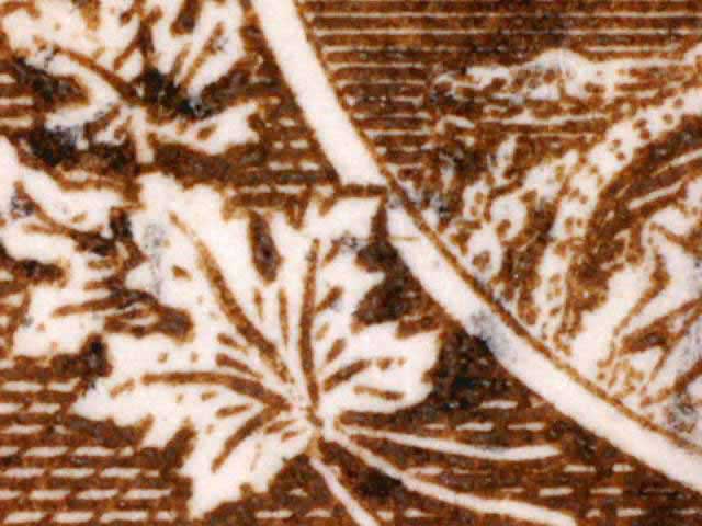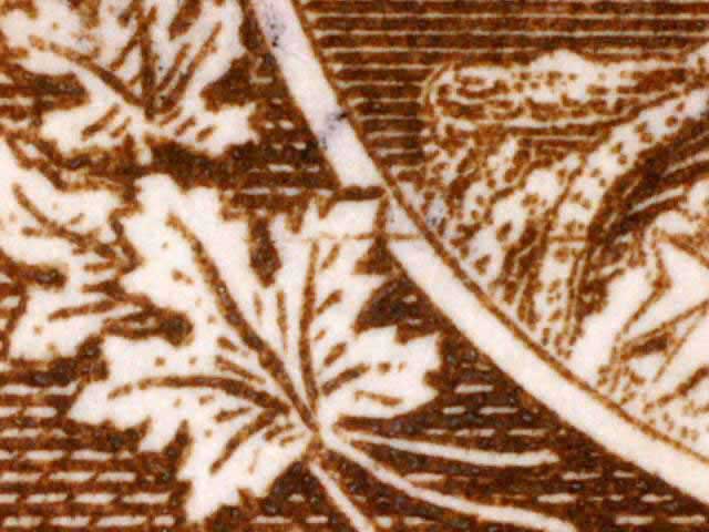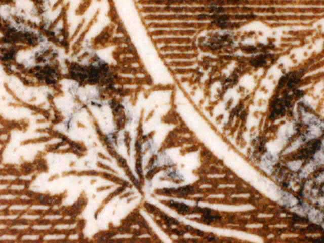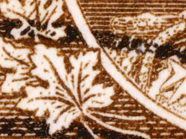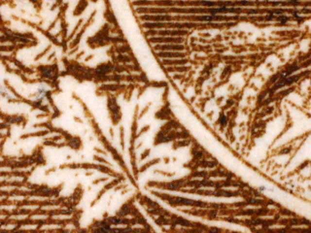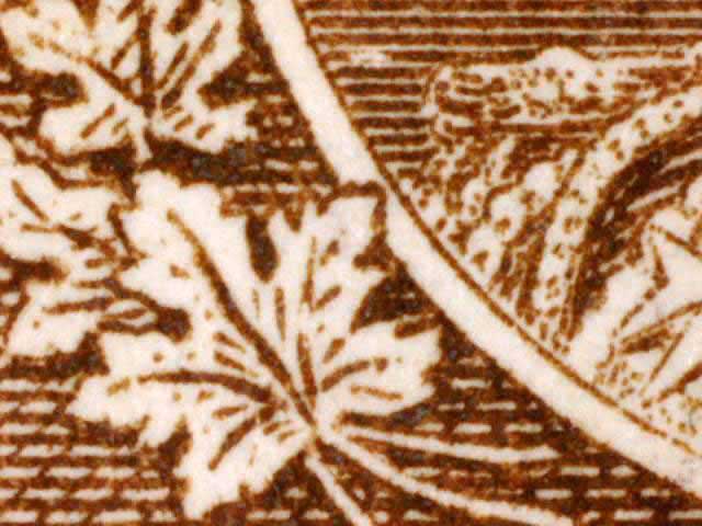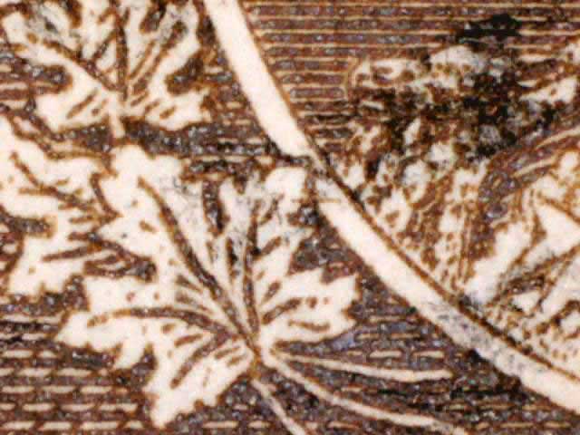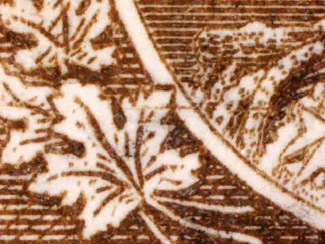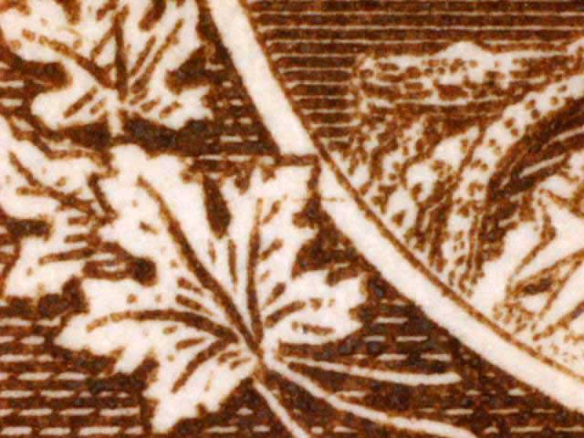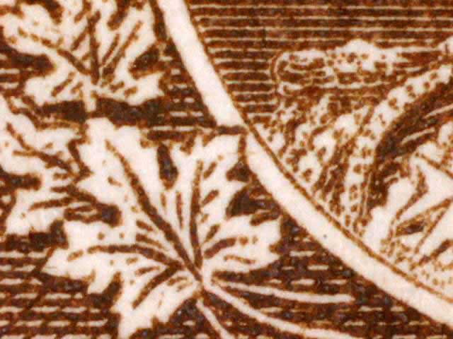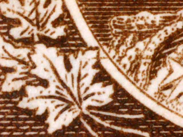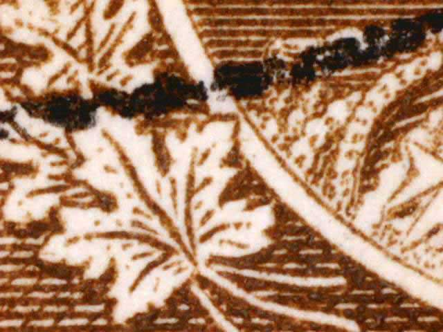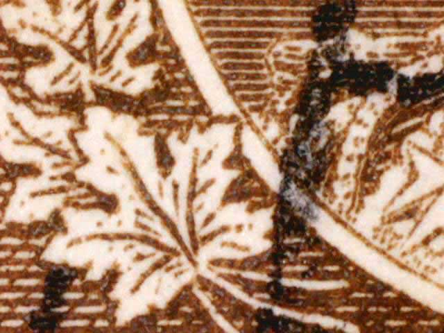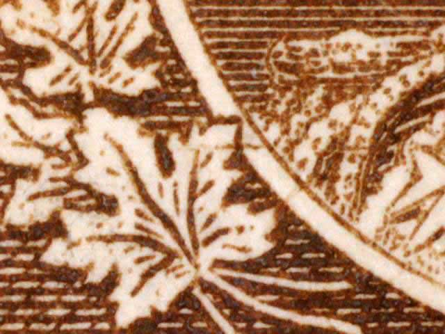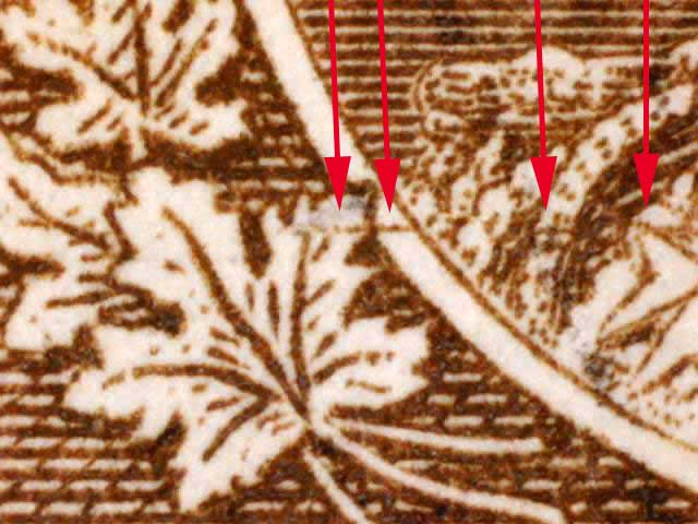 Other evidence exists on some positions showing a horizontal line through the tip of the larger maple leaf above the left numeral box. The line crosses the white portrait oval and on some examples extends on to the King’s cloak. There are differing strengths of this line found on different stamps. (See near the bottom of this page for those lines. DL07 has red arrows pointing to the line.) There are also a pair of fairly horizontal lines in the lower margin of many of the copies seen here. These vary in strength and I have tried to frame the scans to show these lines if they are present.