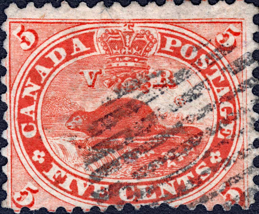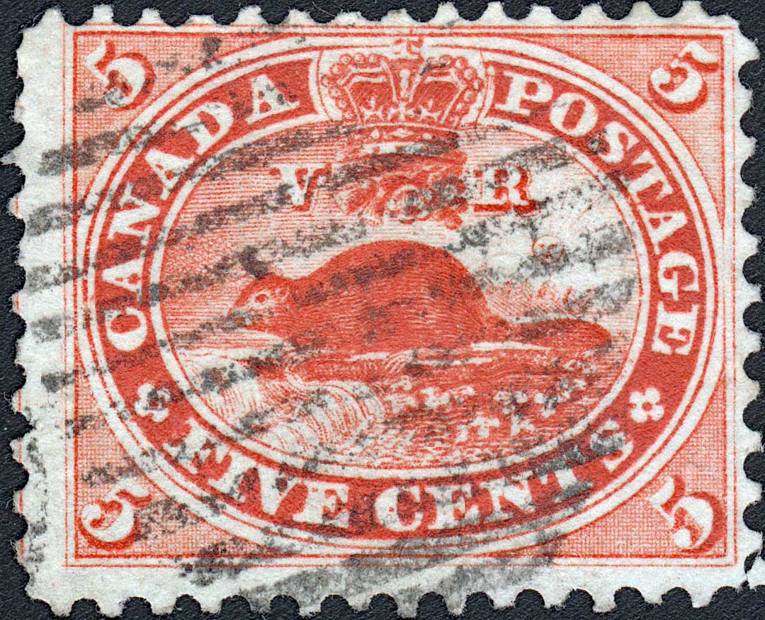 | *38 | Scott #15 Five Cents Re-entry Plate Position #38 State 8-9 R25 Here we see an interesting comparison between different states of the same plate position. Among the many markings visible, note the various dots of colour in ‘IVE CENT’ in the first two stamps. Also note the small vertical dash in the bottom of the ‘D’ which is key in the identification of this position. Note the angled line in the lower margin below the ‘V’ and another in the white border above the first ‘A’ of CANADA. This is an excellent example of how drastically the stamp changed from one state to the next, and why it can be so very tricky making an idenification. Both of the two stamps are Courtesy of Earl Noss.