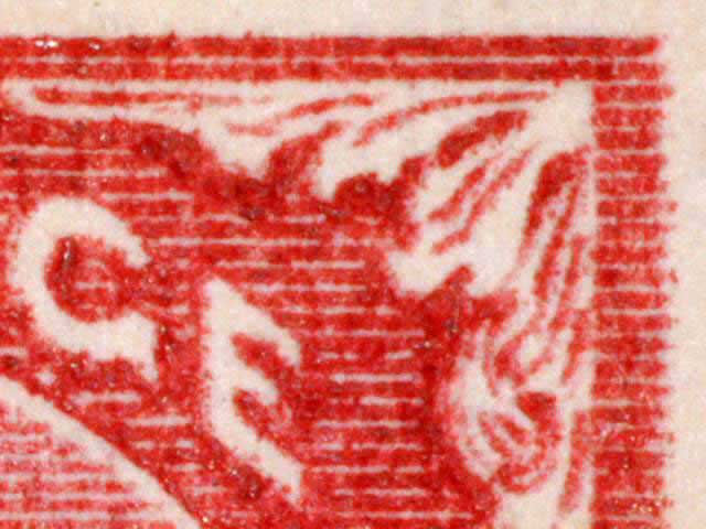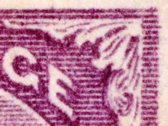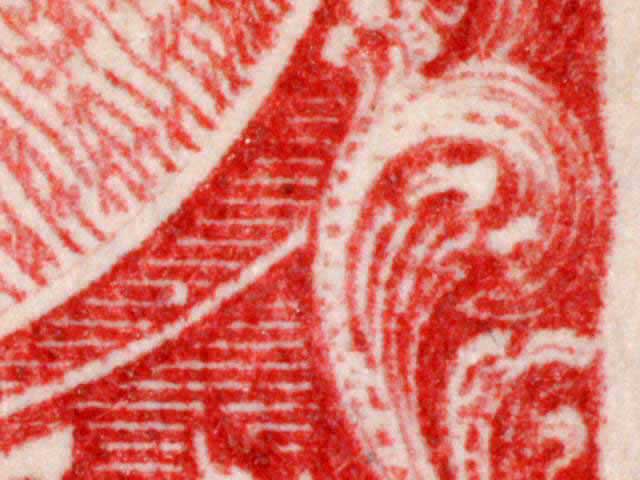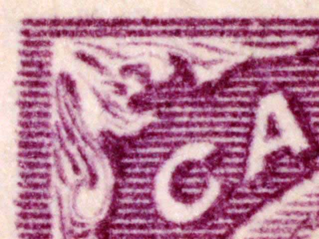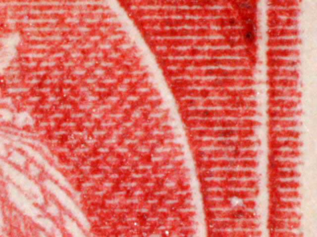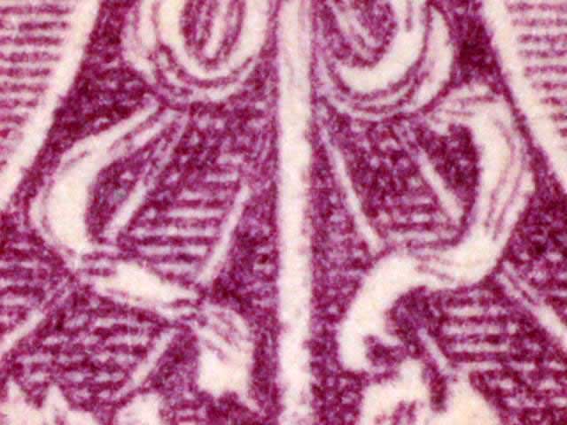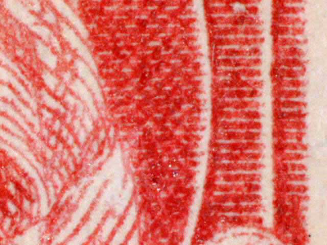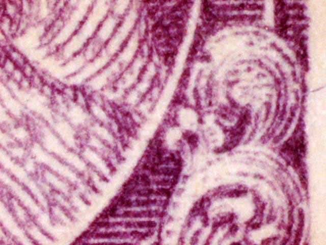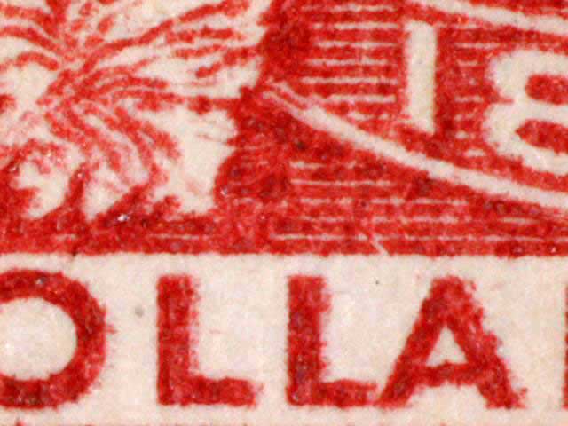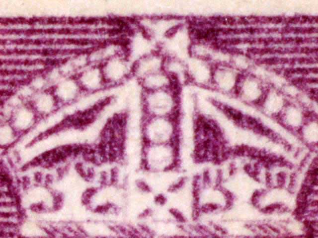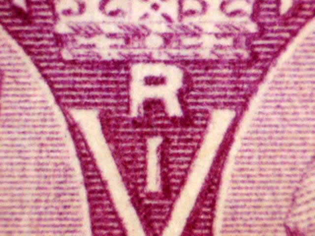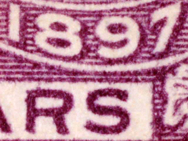 The first stamp is the $1 Jubilee, while the second is the $2 Jubilee. The $2 has what appears to be a definite re-entry in the centre area in the ‘R’ & ‘I’ as well as the lower left area of the left portrait oval, which shows clear extensions of the background lines into the white oval. However, there are also many signs of slippage as well. (Re-entry AND slip print combined? It could happen!)