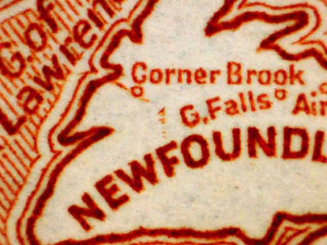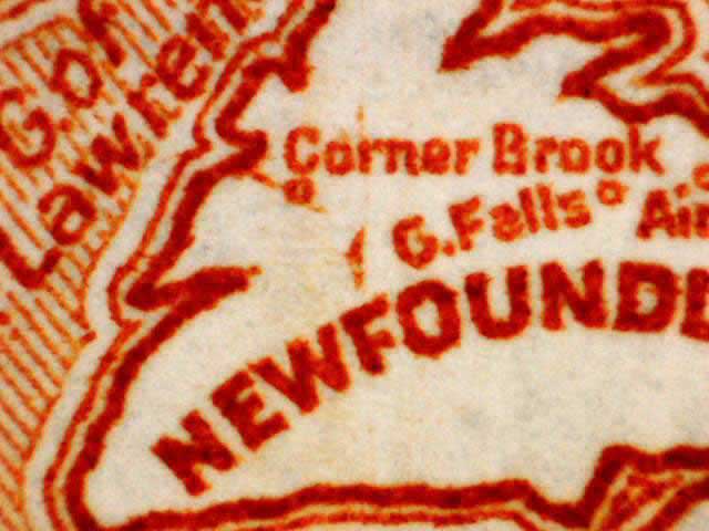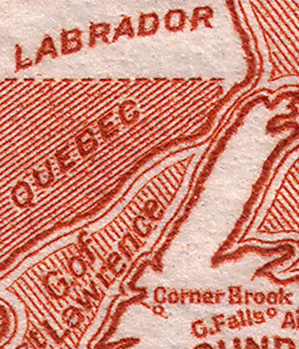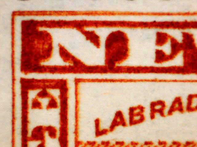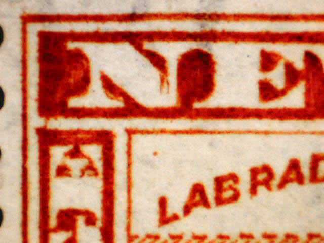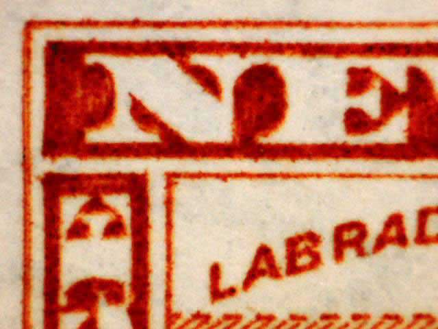 While searching for re-entries on this stamp, I came across several items that appear to have a misplaced portion of design across a very narrow vertical band through the 'r' of 'Corner' and the 'F' of NEWFOUNDLAND. This design element appears to wear off of the plate, as seen in the following two examples.
