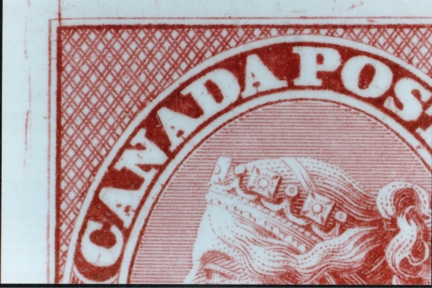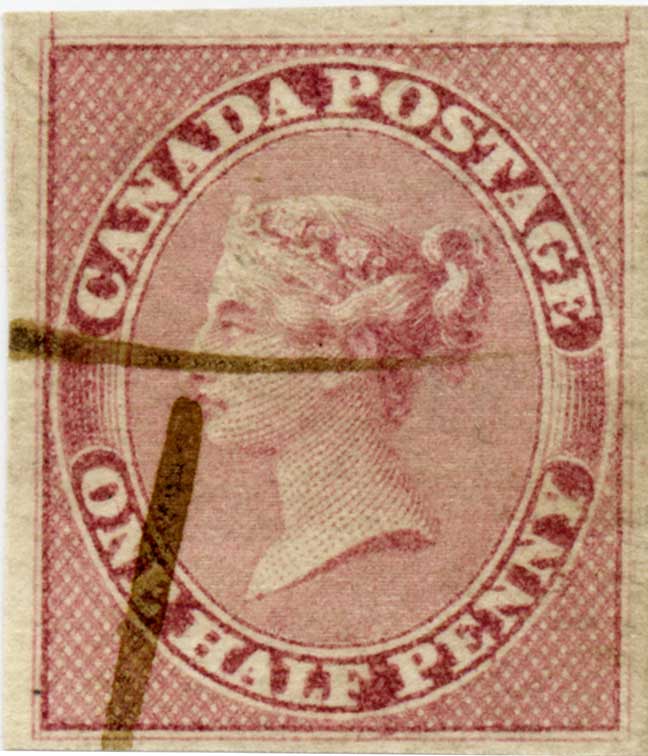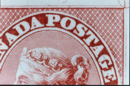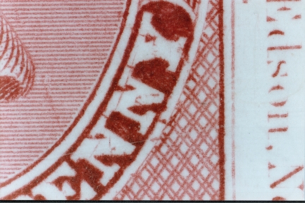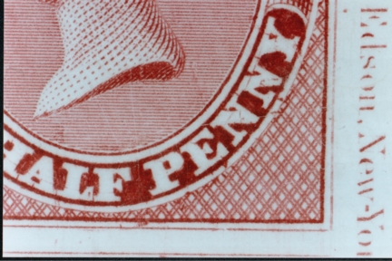 Feature* * * * * *Scott #8 One Half Penny Major Re-entry Plate Position #96 And here is a copy of the printed stamp. Note how the differences in paper used for the proofs and the stamps make an enormous difference in the clarity of the details of the re-entry. This stamp was submitted by Domenic DiMartella-Orsi. Courtesy of Domenic DiMartella-Orsi Return