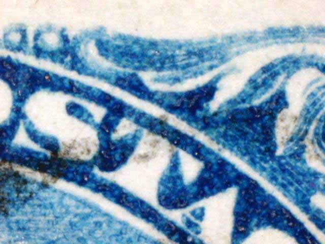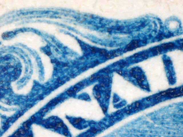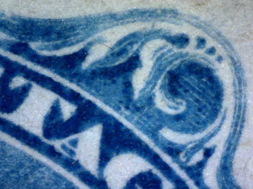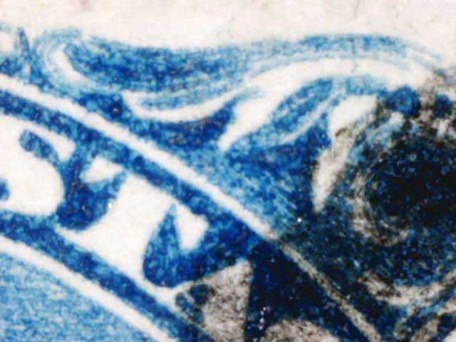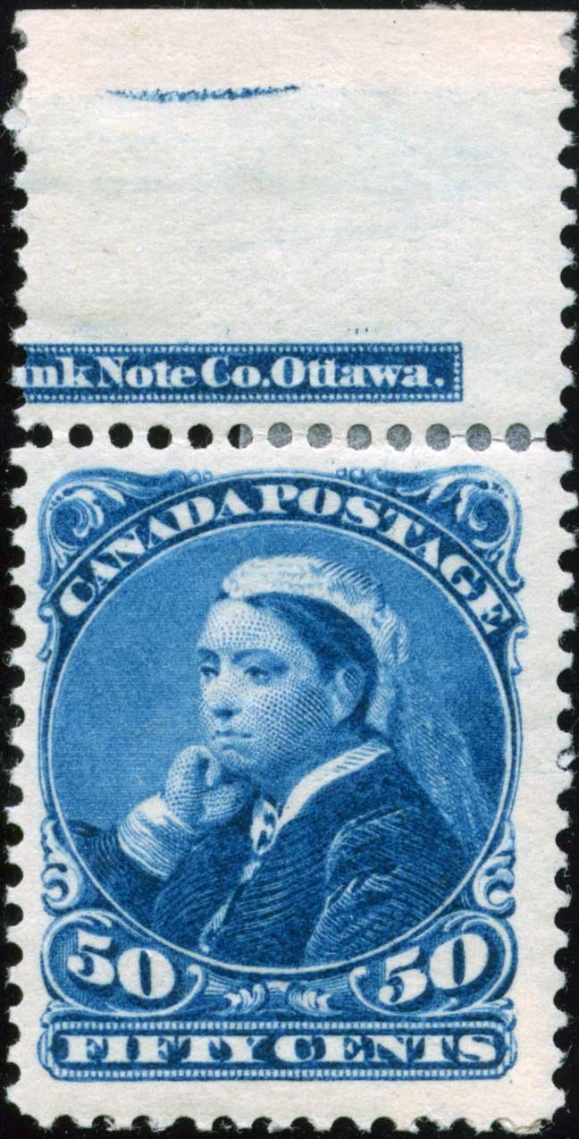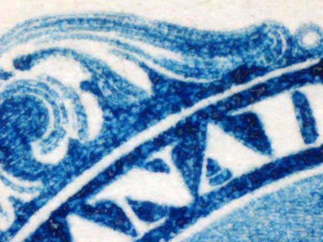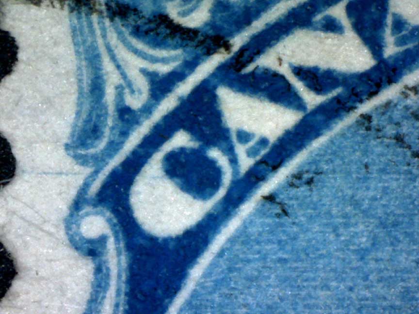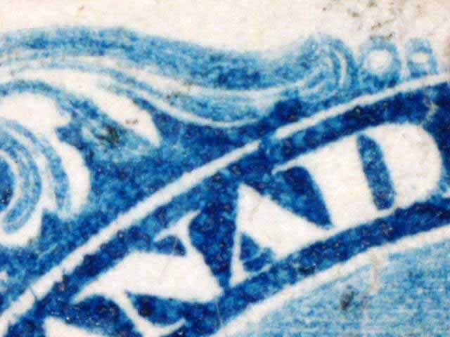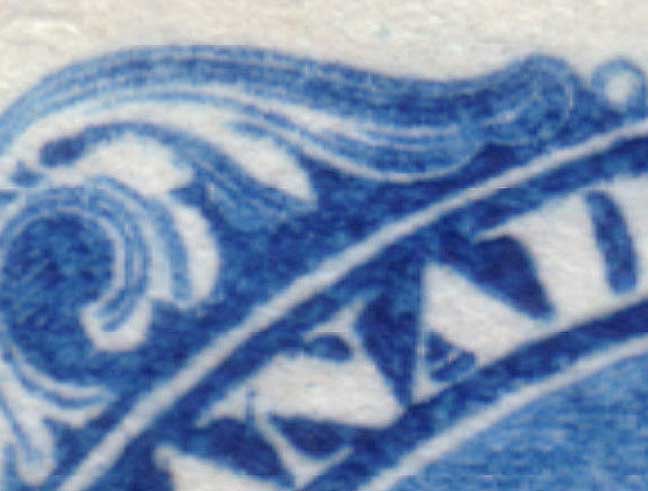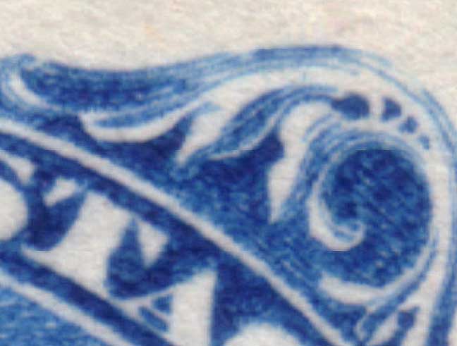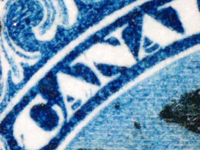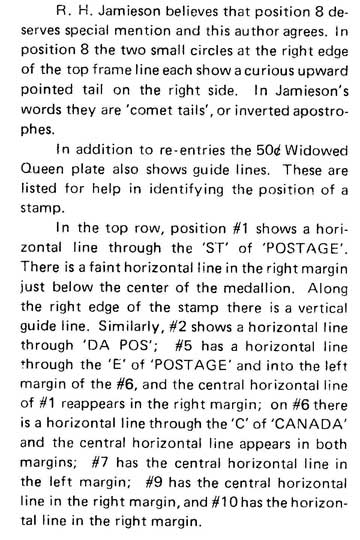 Major! There was also some discrepancy about the plate position over the years. Some said it was position 6, while others said 5. In Vol. 41, No. 5 of BNA Topics, George Arfken published the best work on the re-entries of this stamp to date. It shows that almost the entire top row of the sheet exhibits doubling of the top-centre framelines and illustrated them with line-drawings. This study also proved finally that the so-called 'major' is indeed from position #6. (This is found beneath the right half of the top imprint.) Along with doubling of the top-centre frameline, there is doubling of the upper right ornament and the portrait oval below 'A PO.' Position 6 also has a faint guideline through the left margin into the 'C' of CANADA. I have attempted to plate this stamp and the others shown below from George's article. ^ The above plate piece confirming position 6, Courtesy of John Newman ^ ^ From the RETrimble Collection ^ Closeup of the upper frameline showing the doubling of the frameline as well as the ornamental balls on either side Guideline from margin through the 'C' as described years ago by Hans Reiche Another guideline on the right extending through the right margin from below the mid-point Detail of UL corner ornament showing doubling Detail of UR corner ornament showing doubling ^ From the RETrimble Collection ^ Below I have reproduced the two tables from BNA TOPICS, Sept.-Oct. 1984, with the descriptions and line drawings from George Arfken's article, THE RE-ENTRIES OF THE 50¢ WIDOWED QUEEN, p.11-14. Also with the tables is a description from the same article regarding the guidelines that are visible on a number of the plate positions. This information is extremely helpful in distinguishing between similar positions. *4 Fifty Cents Scott #47 Re-entry Plate Position #7 This stamp shows the nice, even doubling of both top-centre lines. It also has the faint central guideline at left-centre as described by Arfken above. ^ From the RETrimble Collection ^ *5 Fifty Cents Scott #47 Re-entry Plate Position #8 Here we see the faint remnants of a re-entry above the 'P' of POSTAGE, as mentioned in Arfken's text above. Note the small line of doubling in the back of the 'P' as well. This stamp is the left of a pair in my collection, and with the unique nature of the re-entry, the plate position is pretty certain. This means the position of the following stamp, #9, is also certain. ^ From the RETrimble Collection ^ *6 Fifty Cents Scott #47 Re-entry Plate Position #9 Unfortunately, the black spot of cancel above the centre of 'PO' obliterates the tiny dot of colour in the broken inner line, as seen above in the diagram, but as mentioned above, this stamp is the right of a pair in which the left stamp has been clearly identified as position #8. This stamp also has the faint central guideline at right-centre, as described in the text above. It is uncertain as to whether the mark in the 'T' of POSTAGE is constant. ^ From the RETrimble Collection ^ Fifty Cents Scott #47 Re-entry Plate Position #2 This stamp shows clear doubling of the upper centre frameline. There also appears to be a scratch through 'A PO.' ^ From the RETrimble Collection ^ Fifty Cents Scott #47 Re-entry Plate Position Unknown #2 This is another uncertain position. The doubling is even wider than the so-called 'major' of #6, but there is no guideline visible. ^ From the RETrimble Collection ^ Fifty Cents Scott #47 Re-entry Plate Position Unknown #3 This is another uncertain plate position. NOTE: Arfken also mentioned in his article that having examined the stamps from the lower rows of the plate, some positions do show a "slight doubling" of the top frame and "a broadening or smudging of the corner lines," but that NONE of them seem to have major re-entries. Considering the amount of doubling he does describe as 'major,' I would think that these re-entries with "slight doubling" on the rest of the plate must be VERY minor indeed. Therefore, my three 'unknowns' here are likely from the top row of 'majors.' ^ From the RETrimble Collection ^ Fifty Cents Scott #47 Re-entry Plate Position # Fifty Cents Scott #47 Re-entry Plate Position # *12 Fifty Cents Scott #47 Plate Position #10 The scan of this position was submitted by Glenn Archer to show that position #10 in the top row is sharp and not re-entered. This coincides with Arfken's chart, above. Glenn owns a pair that he had correctly determined to be pp9-10 and by comparing his pair to my pair of pp8-9, we were able to confirm that for him. This stamp, then, is shown for reference purposes only. Courtesy of Glenn Archer Return to Index Return to Listings Page